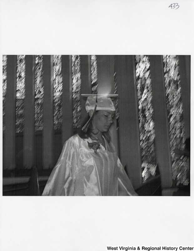 - Suzanne Rahall walks in front of the camera in graduation regalia at her commencement ceremony.