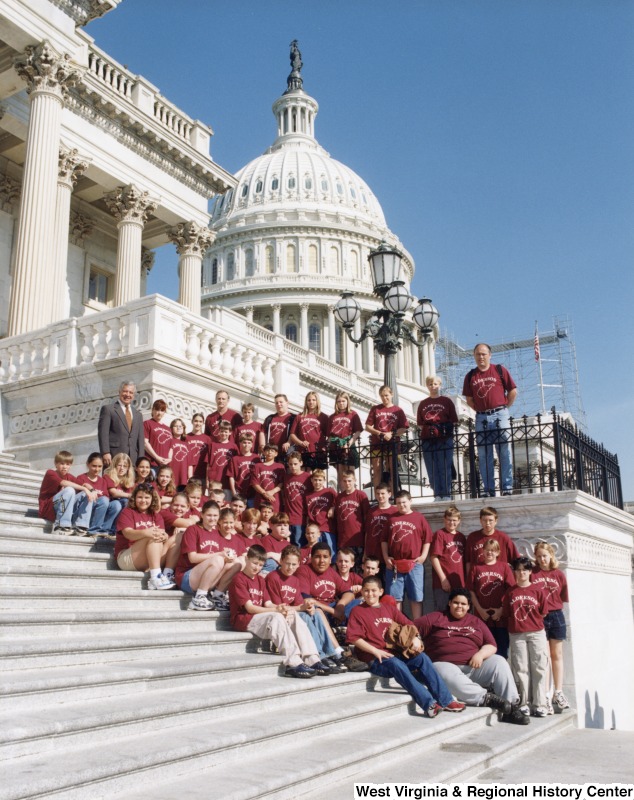 - On the far left, Representative Nick J. Rahall (D-W.Va.) stands with an unidentified group of children in red shirts in front of the Capitol building.