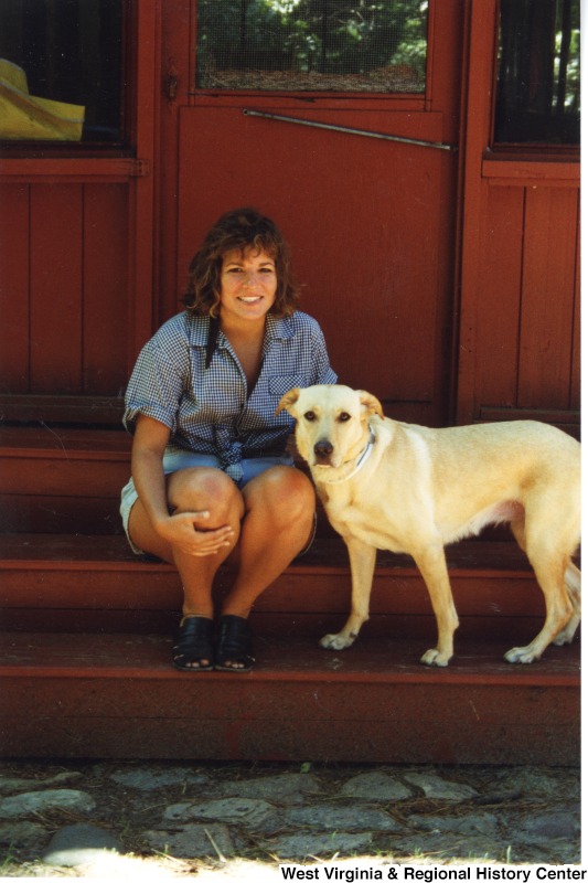 - Photograph of an unidentified woman sitting on a porch with a dog