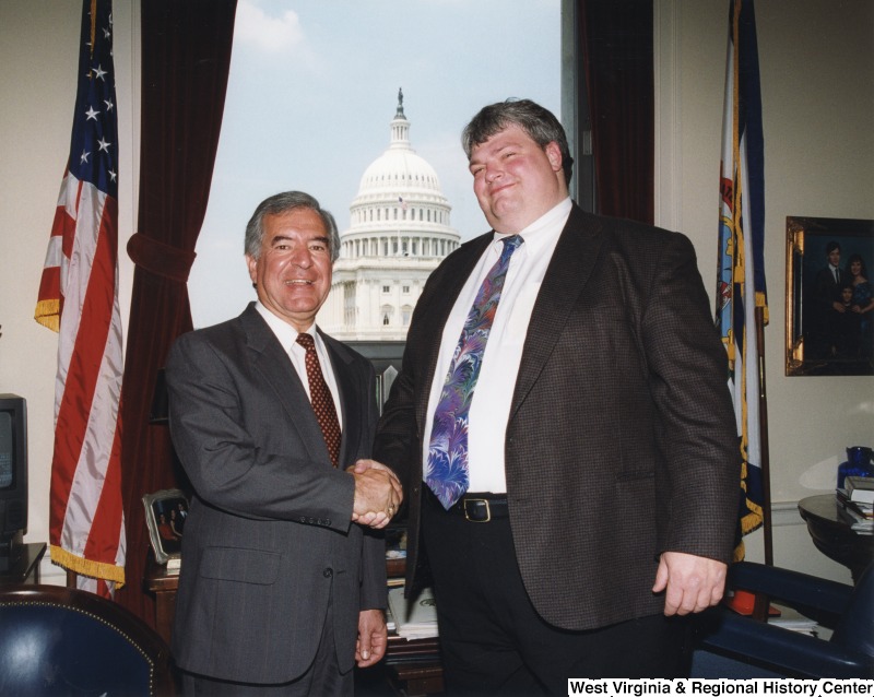 Photograph of Congressman Rahall shaking hands with Victor McClure