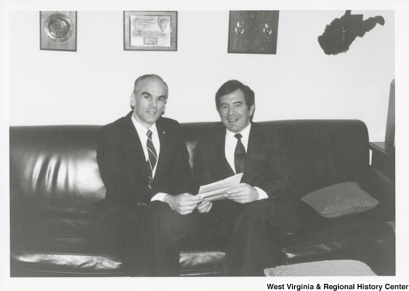 - Secretary Donald P. Hodel sits on a couch and looks over papers with Representative Nick J. Rahall (D-W.Va.).