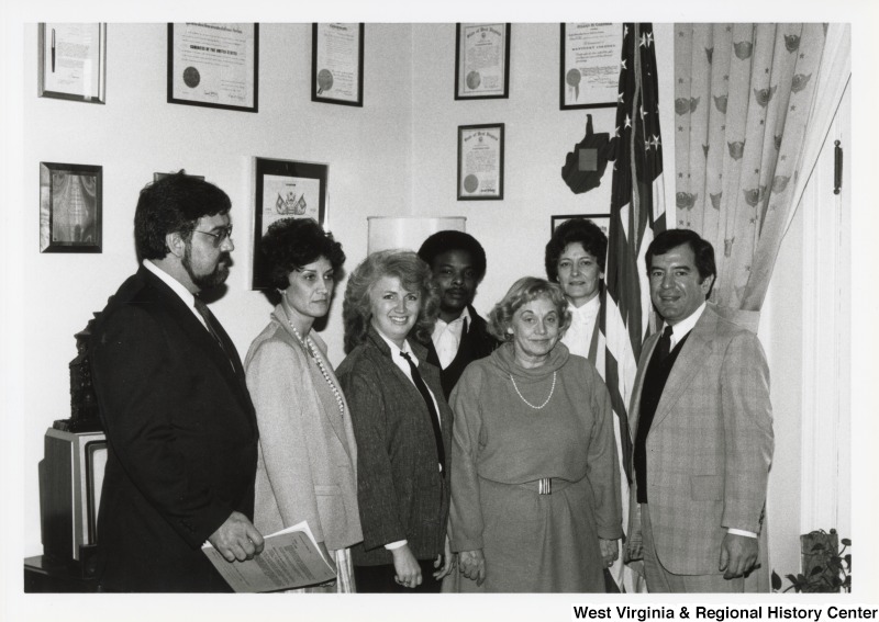 - On the far right, Representative Nick J. Rahall (D-W.Va.) stands for a photograph with six unidentified people.