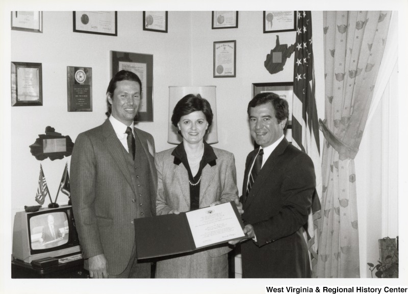 - On the right, Representative Nick J. Rahall (D-W.Va.) presents a folder to an unidentified woman and an unidentified man.