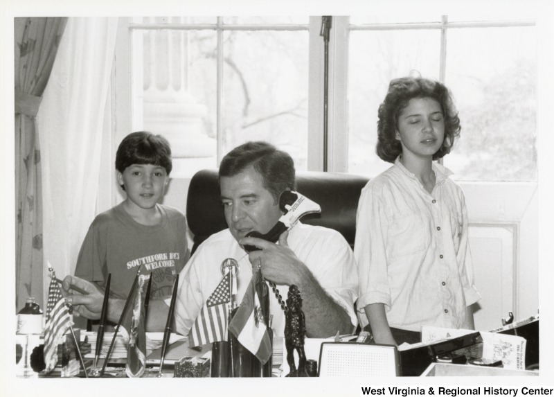 - Representative Nick J. Rahall (D-W.Va.) sits at his desk on the telephone between two unidentified children.