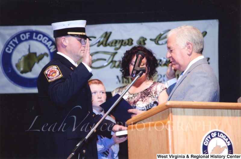 - Photograph of Congressman Rahall swearing in an unidentified officer at the City of Logan Mayor and Council Inauguration