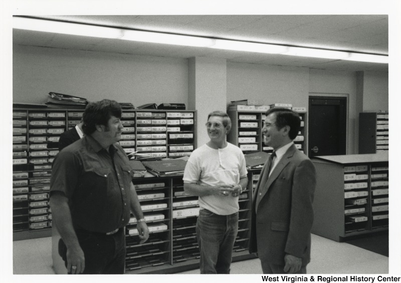- On the right, Representative Nick J. Rahall (D-W.Va.) talks with three unidentified men in a record room.