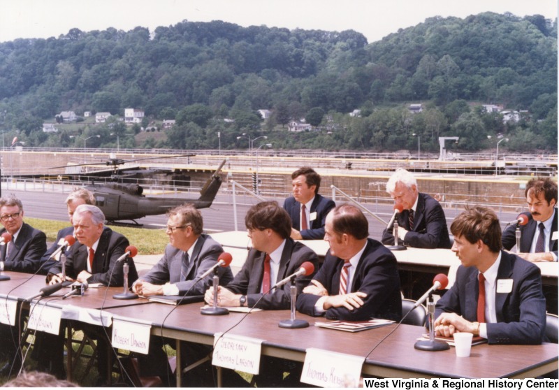 - Photograph of Congressmen Rahall, Wise, Senator Byrd, Secretary Larson, Assistant Secretary to Army Dawson at a meeting near a river lock