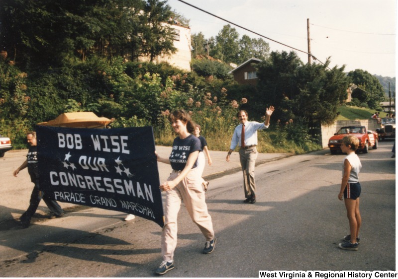 - Congressman Robert E. "Bob" Wise waving to crowd as grand marshal for a parade. A banner that reads "Bob Wise Our Congressman Parade Grand Marshal" is being carried by an unidentified man and woman.