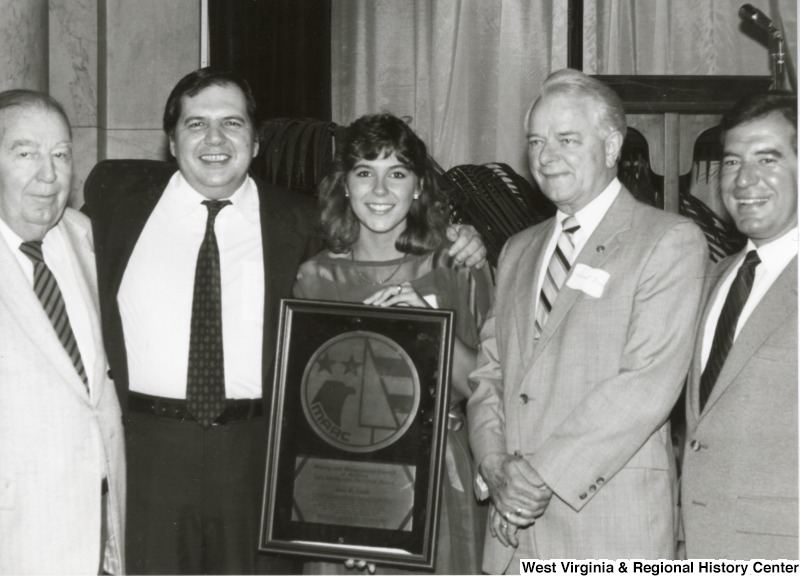 - From left to right: Senator Randolph, an unidentified man and woman, Senator Byrd, and Congressman Rahall at an event.