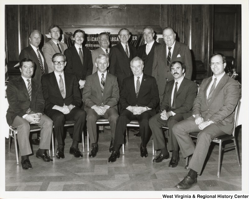 - From left to right in the front row: Congressman Nick Rahall II, Senator John D. Rockefeller, West Virginia University (WVU) President Niel Bucklew, Senator Robert C. Byrd, Congressman Robert "Bob" Wise, and Congressman Harley O. Staggers. In the back row, Senator Jennings Randolph is on the far right in the back row. The other men in the back row are unidentified. Photo taken at WVU Alumni luncheon.