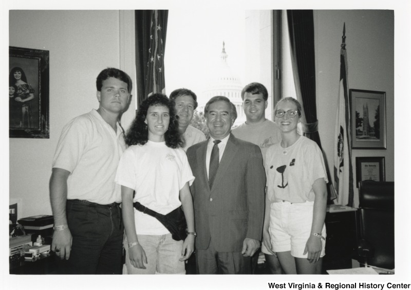 - Representative Nick J. Rahall (D-W.Va.) stands for a photograph with five unidentified people in his office.
