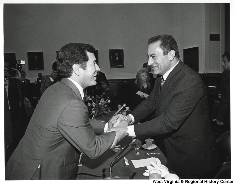 - On the left, Representative Nick J. Rahall (D-W.Va.) shakes hands with Muammad usn Mubrak, President of Egypt at an event.