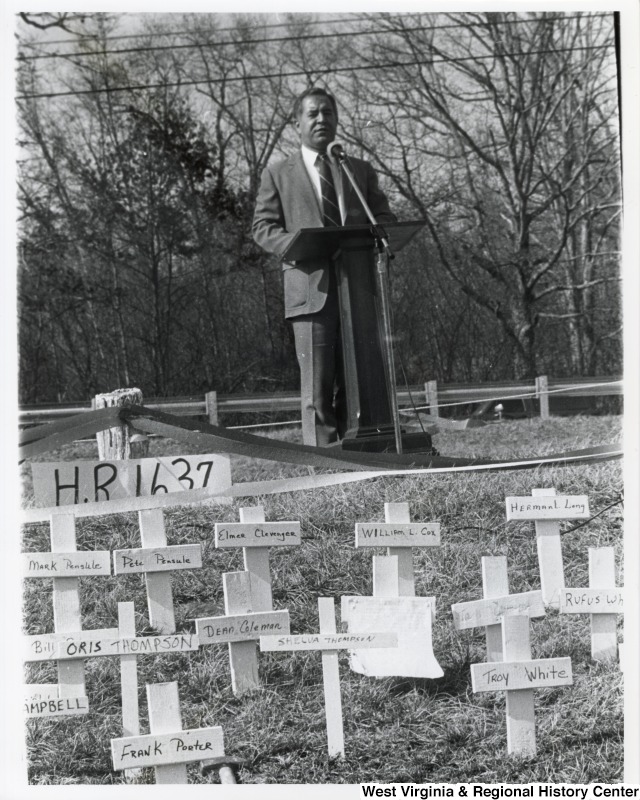 - Representative Nick J. Rahall (D-W.Va.) stands behind a podium outside and gives a speech behind rows of white crosses with names on them for a Black Lung Ceremony.