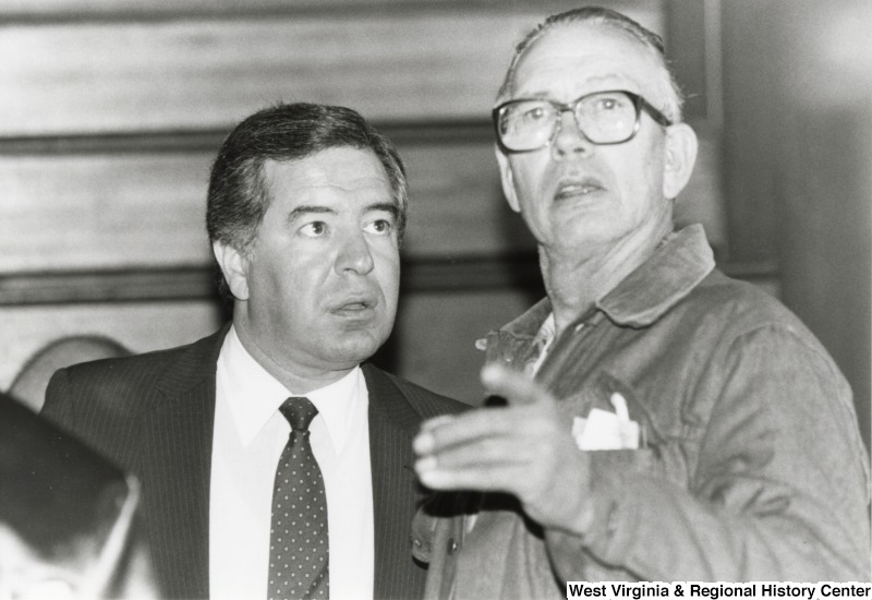 - Congressman Nick Rahall, II (left) speaking to an unidentified man at Marshall University.