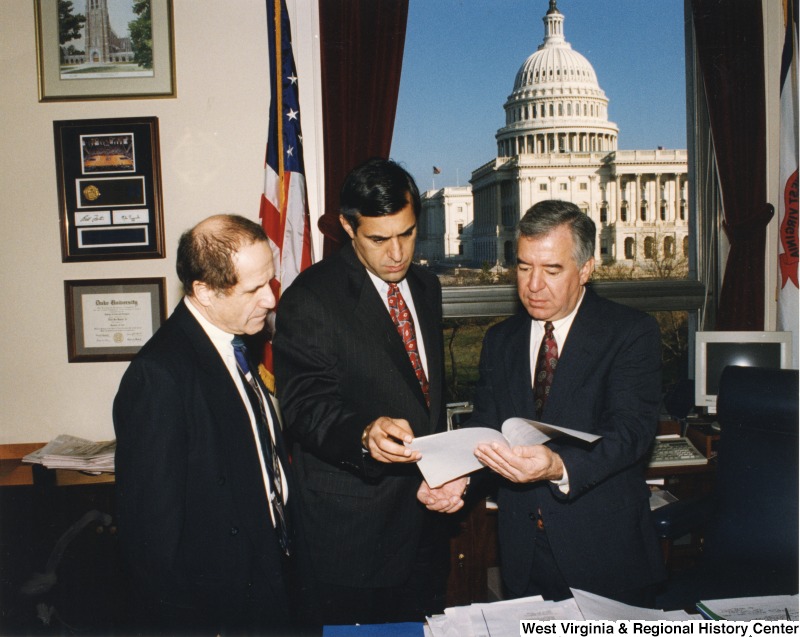 - On the right, Representative Nick J. Rahall (D-W.Va.) looks over papers in his office with two unidentified men.