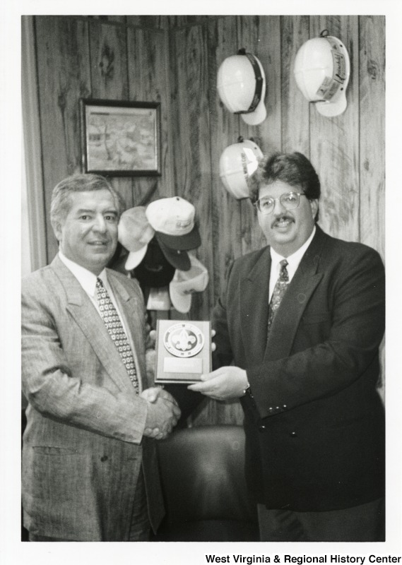 - On the left, Representative Nick J. Rahall (D-W.Va.) shakes hands with Chuck Turner and is presented with an award for Seneca District Boy Scouts of America.